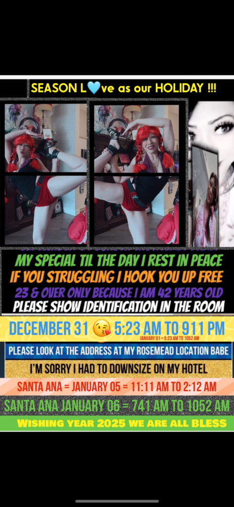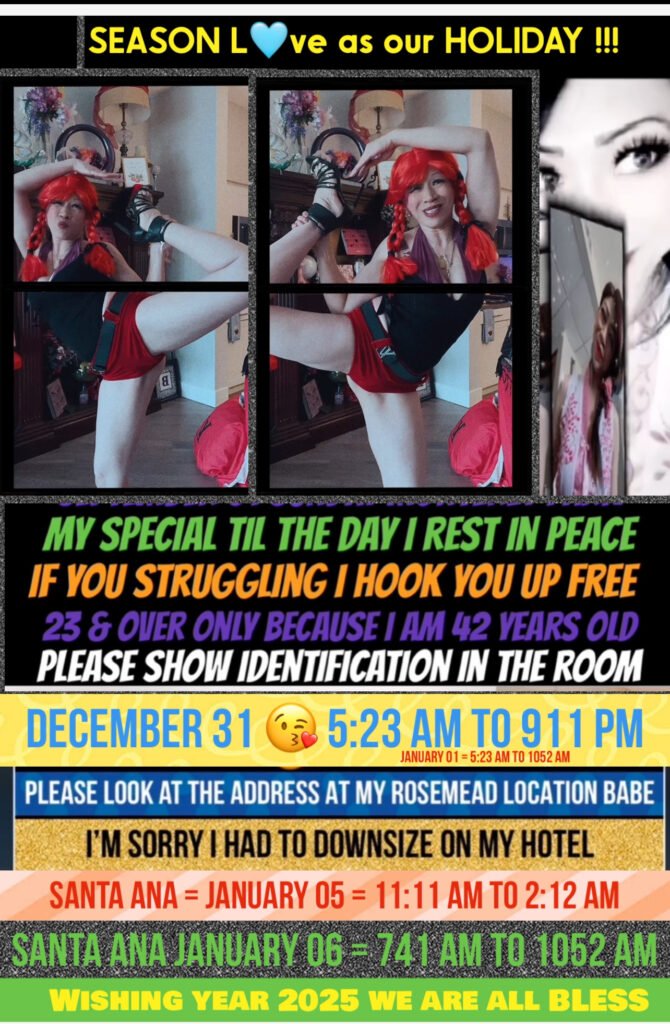 bless year 2025 LilyHOOD WISHING WE ARE ALL BLESS .. DECEMBER 31 ROSEMEAD HONEY .. 523 am to 911 pm .. JANUARY 01.. Early morning appointment… JANUARY 05 SANTA ANA BABE .. sorry I have not been working my night shift everyone.. LIFE BEEN ONE CRAZY KRAZE ROLLER COASTER 4 me .. TODAY IS OFFICIALLY MY 91st day FORCE to be HOMELESS.. THANKS EVERYONE FOR THE LOVE WE SHARE .. thanks 4 loving me & please help give your friends my phone number 23 & over only because I am 42 years old .. Please show Identification in the ROOM ..